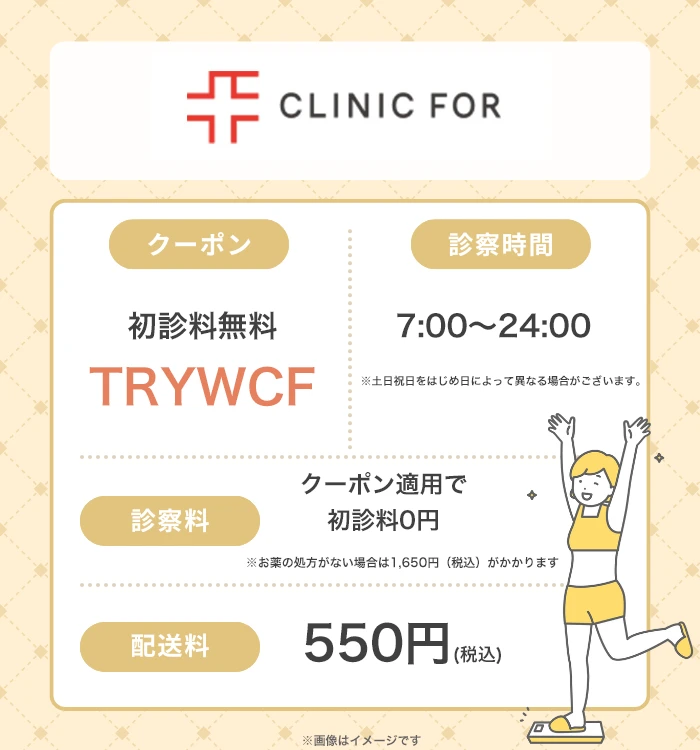 | 診察料(税込) | 0円 ※クーポン「TRYWCF」適用で初診料0円。お薬の処方がない場合は1,650円(税込)がかかります |
